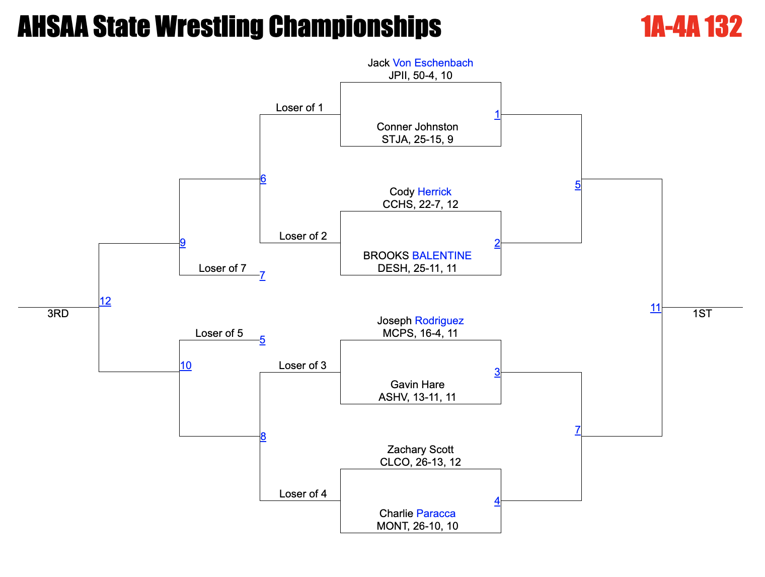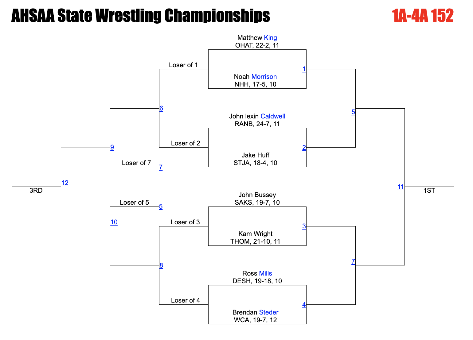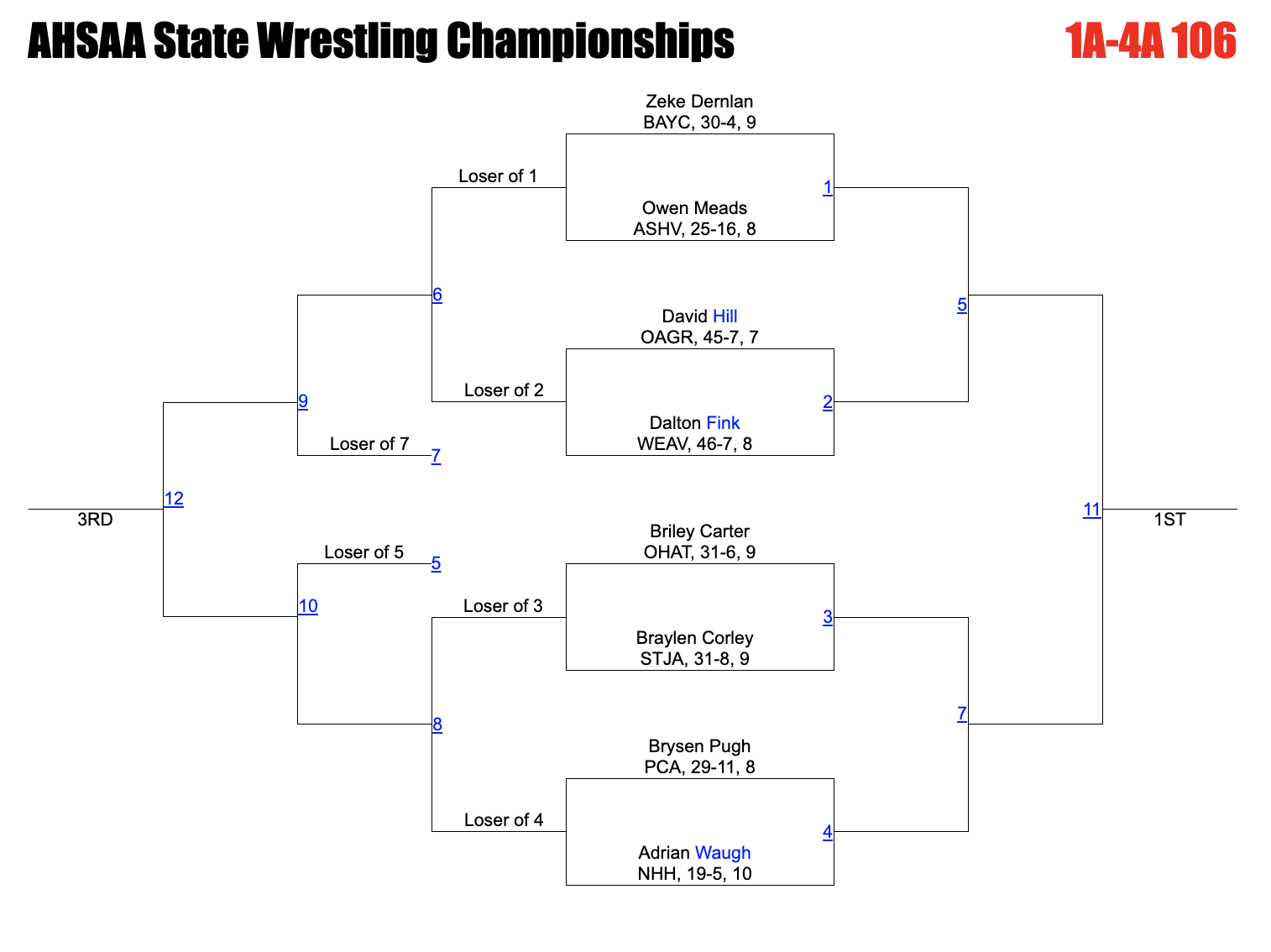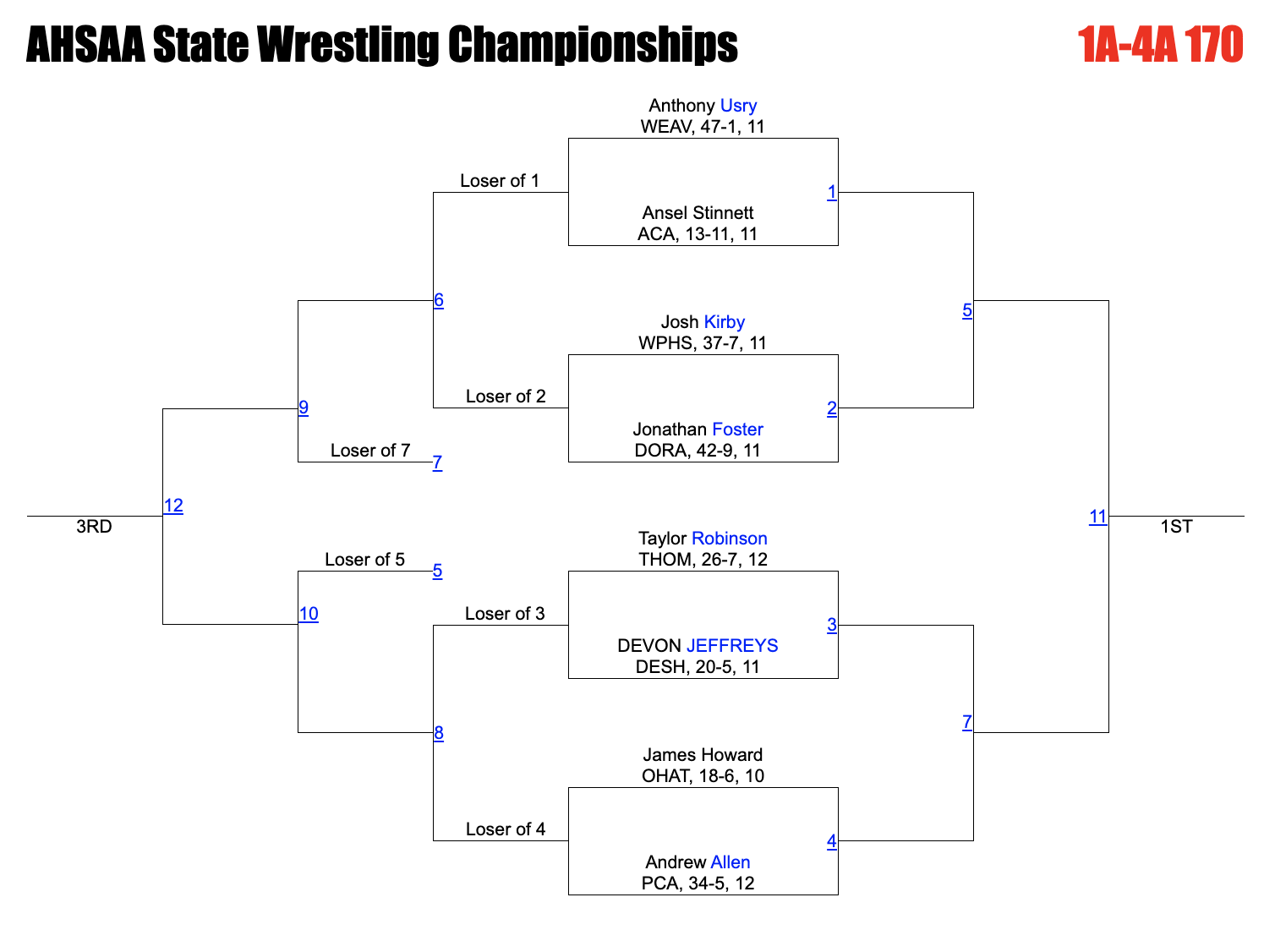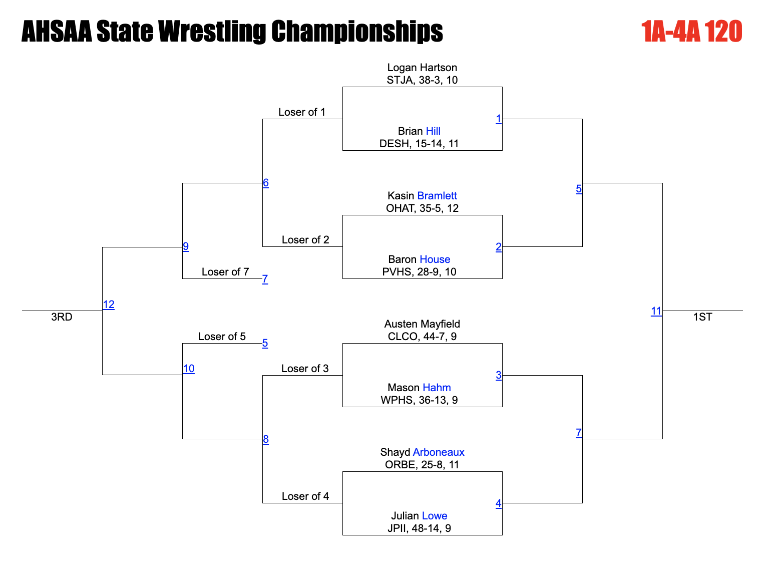 Alabama 1A-4A State Tournament Brackets 106 lbs. 113 lbs. 120 lbs. 126 lbs. 132 lbs. 138 lbs. 145 lbs. 152 lbs. 160 lbs. 170 lbs. 182 lbs. 195 lbs. 220 lbs. 285 lbs. Jason FulmoreFebruary 14, 2022Comment Facebook0 Twitter LinkedIn0 Reddit Tumblr 0 Likes