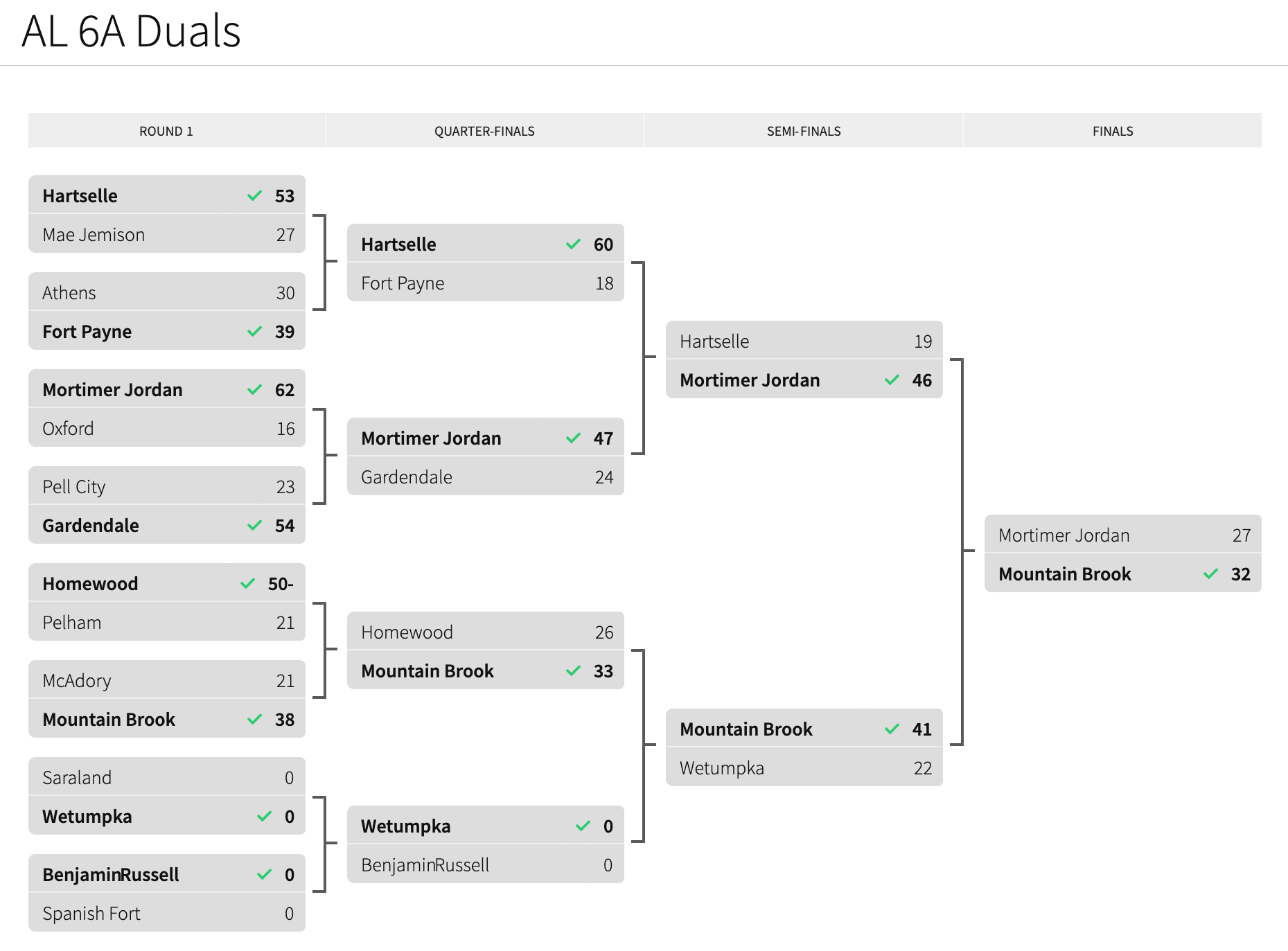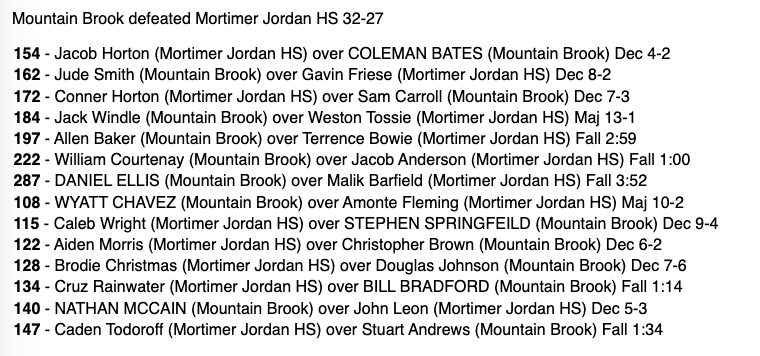 Mortimer Jordan and Mountain Brook battled back and forth in the first 3 matches before Mountain Brook’s upperweights took control. With the dual 6-3, Jack Windle got a 13-1 major decision, Allen Baker added a fall at 197, and William Courtenay and Daniel Ellis added falls at 220 and 285. Mountain Brook led 25-6 heading to the lightweights. Wyatt Chavez added four more points with a 10-2 major decision and the Spartans were in control 29-6. Mortimer Jordan began chipping away at the lead with decisions by Caleb Wright, Aiden Morris, and Brodie Christmas from 113-126 to make the dual score 29-15. A big fall by Cruz Rainwater pulled Mortimer Jordan within striking distance (29-21) as Nathan McCain and John Leon took the mat with two matches remaining. McCain’s 5-3 win gave Mountain Brook the title.