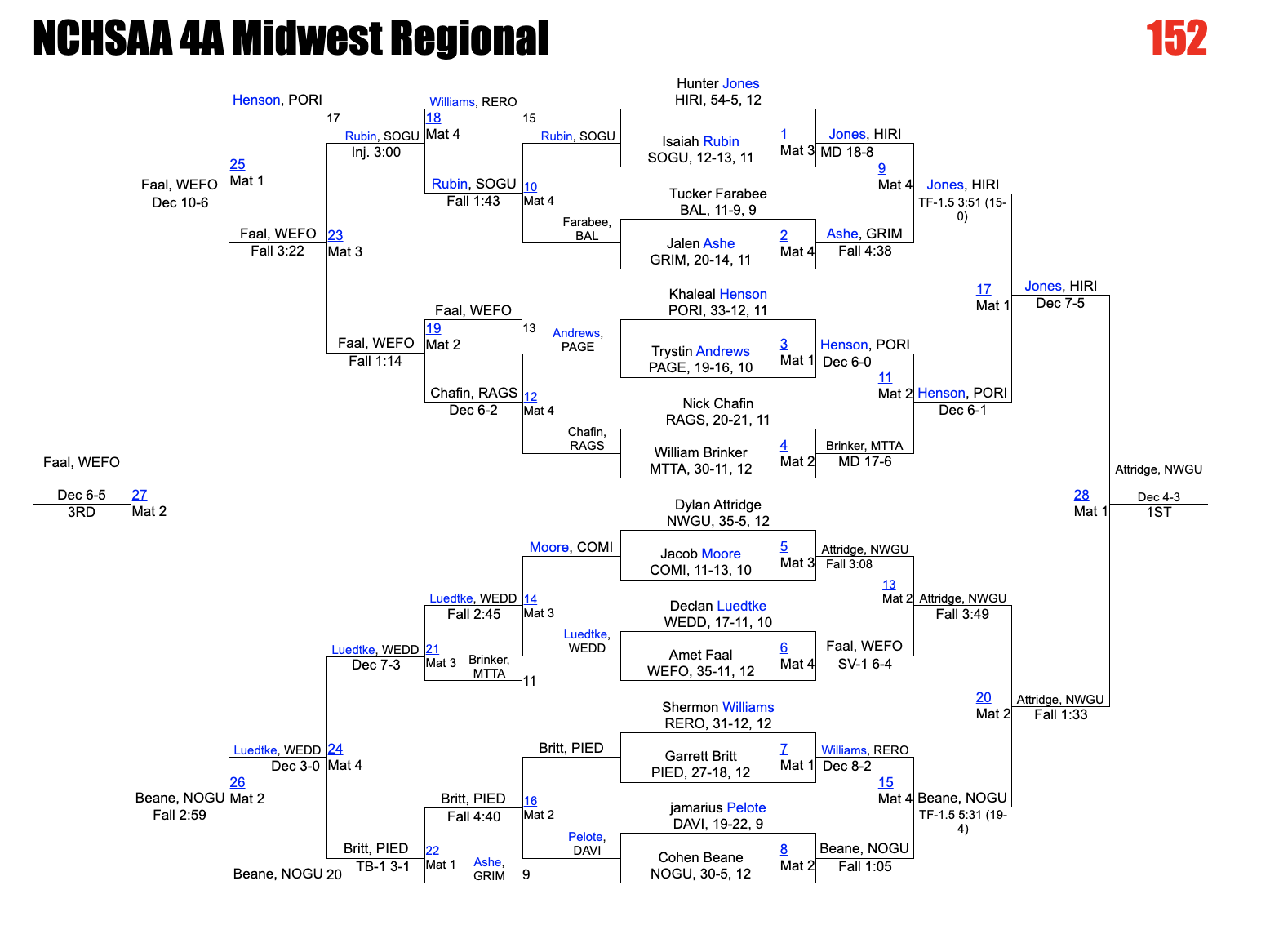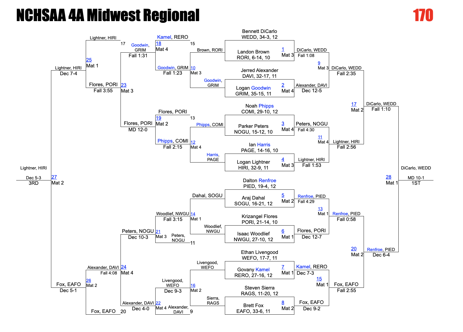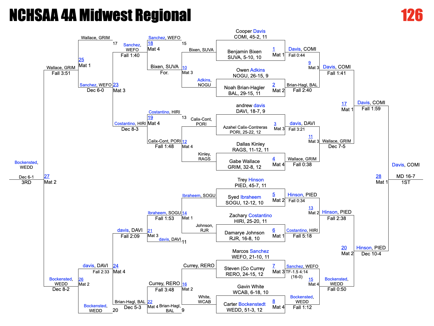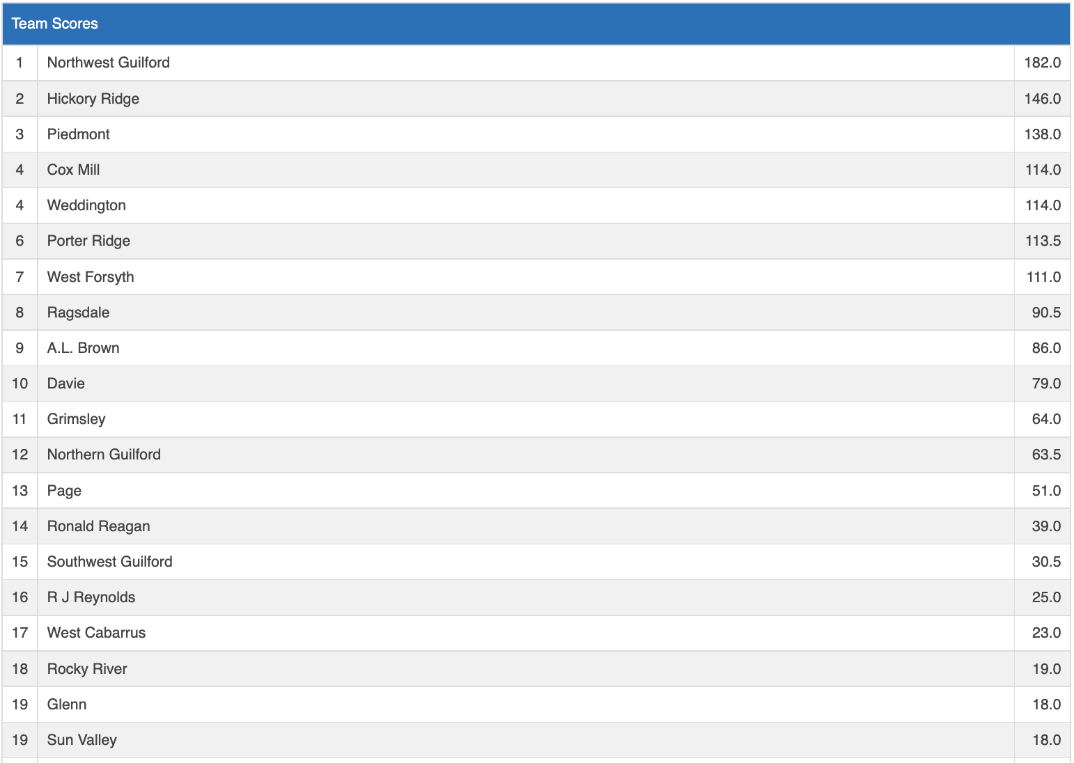 NW Guilford tops Hickory Ridge and Piedmont to take the Midwest crown. NW Guilford punches 7 tickets to the state tournament and will rely on their hammers - 4 champs if they are going to claim a traditional title in addition to the dual title they won last weekend. Piedmont puts 7 through and Hickory Ridge have 6 qualifiers … both teams will be in the hunt as well.