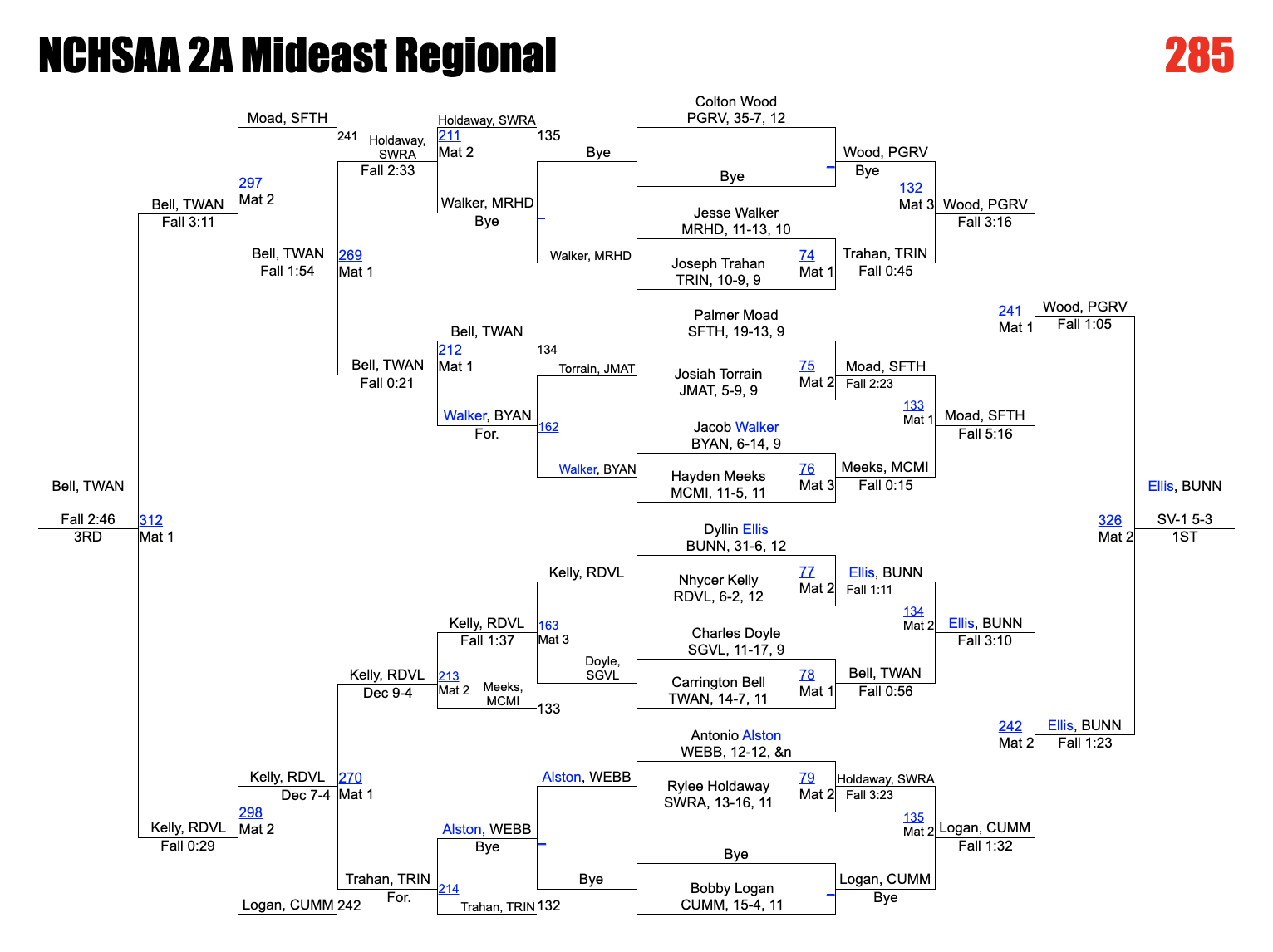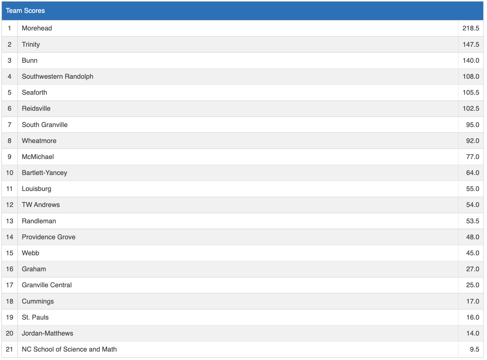 Morehead puts up 218 and outdistances Trinity and Bunn for the Mideast Region Titles. Morehead punches 9 through to the state tournament - they also crowned 5 champs. If those 9 can do work next weekened - Morehead is a team to keep an eye on.