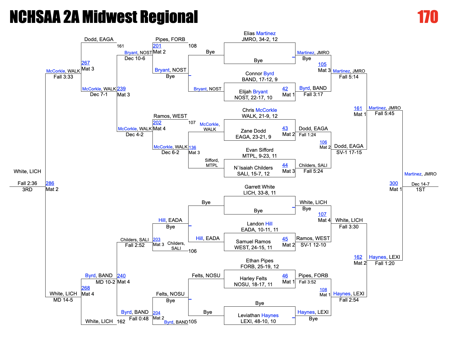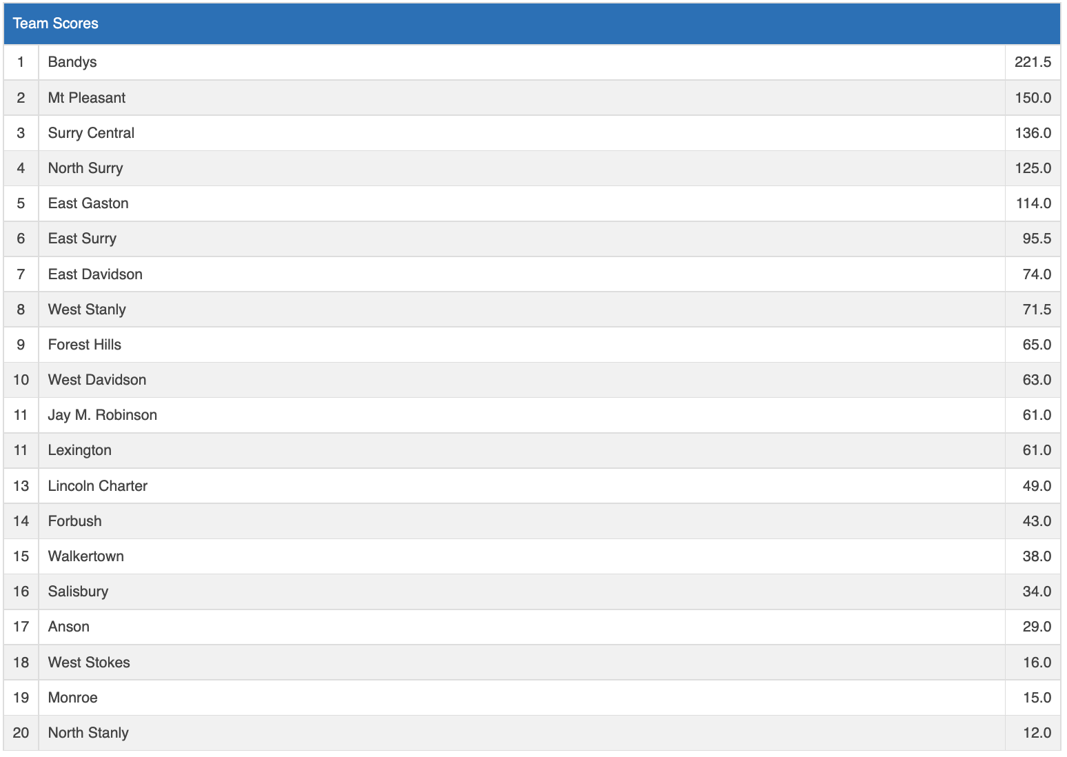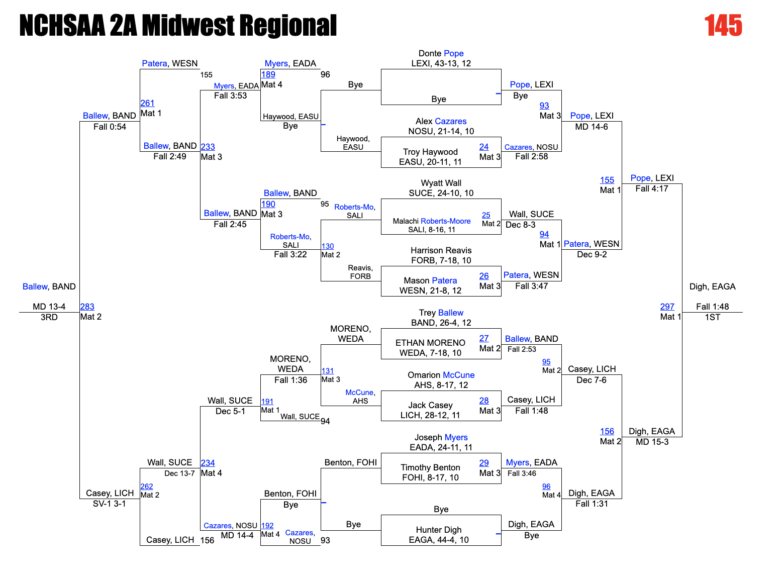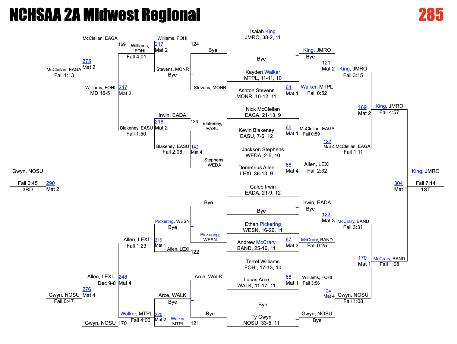 2A Midwest Region Results Bandys puts 9 through to the state tournament tops Mt Pleasant, Surry Centra, and North Surry. Nix, Moore, and Evans each claimed a title for Bandys. Mt Pleasant punches 6 through with 4 champs. Jason FulmoreFebruary 11, 2023Comment Facebook0 Twitter LinkedIn0 Reddit Tumblr 0 Likes
