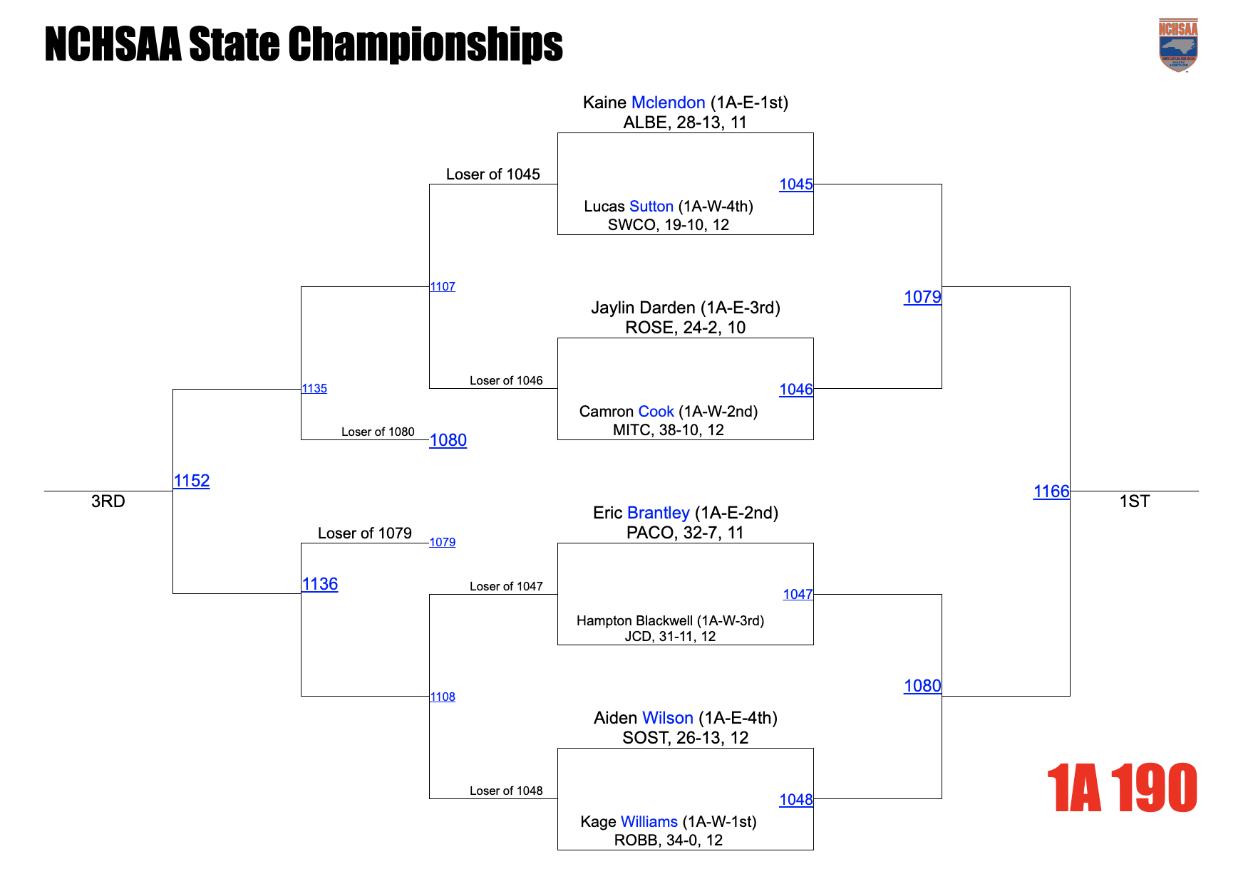 Thoughts: Kage Williams is one of two wrestlers this weekend looking for a 4th state title. Not sure there is a bigger favorite in 1A than Kage as he looks to cap off an outstanding prep career. Mclendon won the East with a 6-3 decision of Brantley, but I can’t imagine anyone knocking off Williams in his final run.