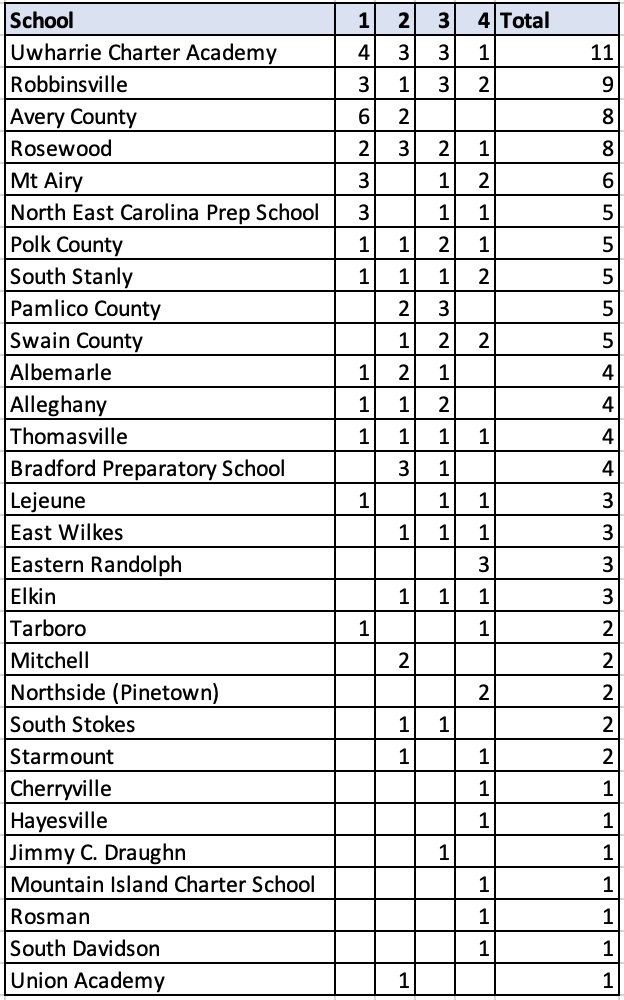 Just 6 teams had State Champions. This is also fairly unusual as compared to the other classifications. No other team in Greensboro had nearly the number of individual State Champions that we saw Avery County put on the top step last year. 21 of the 36 teams had at least one state placer - which is fairly typical compared to the other classes.