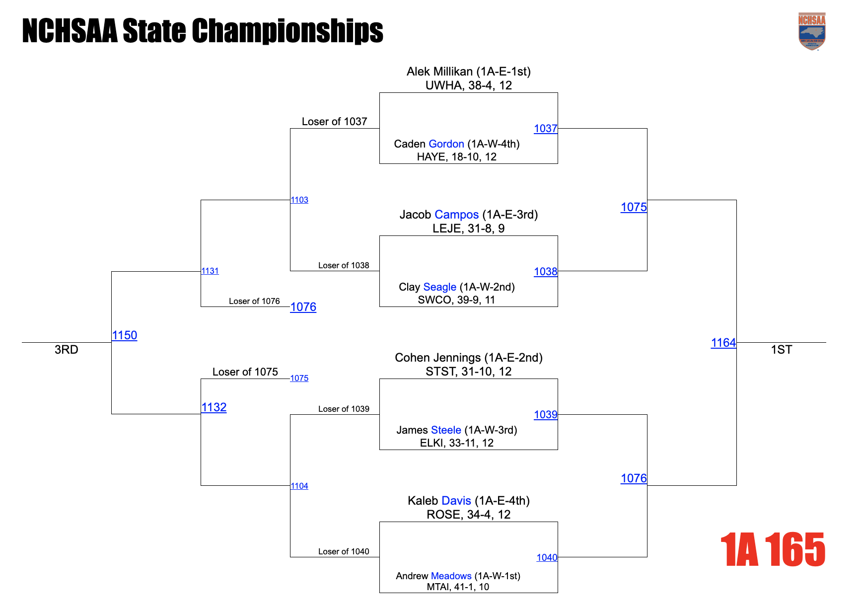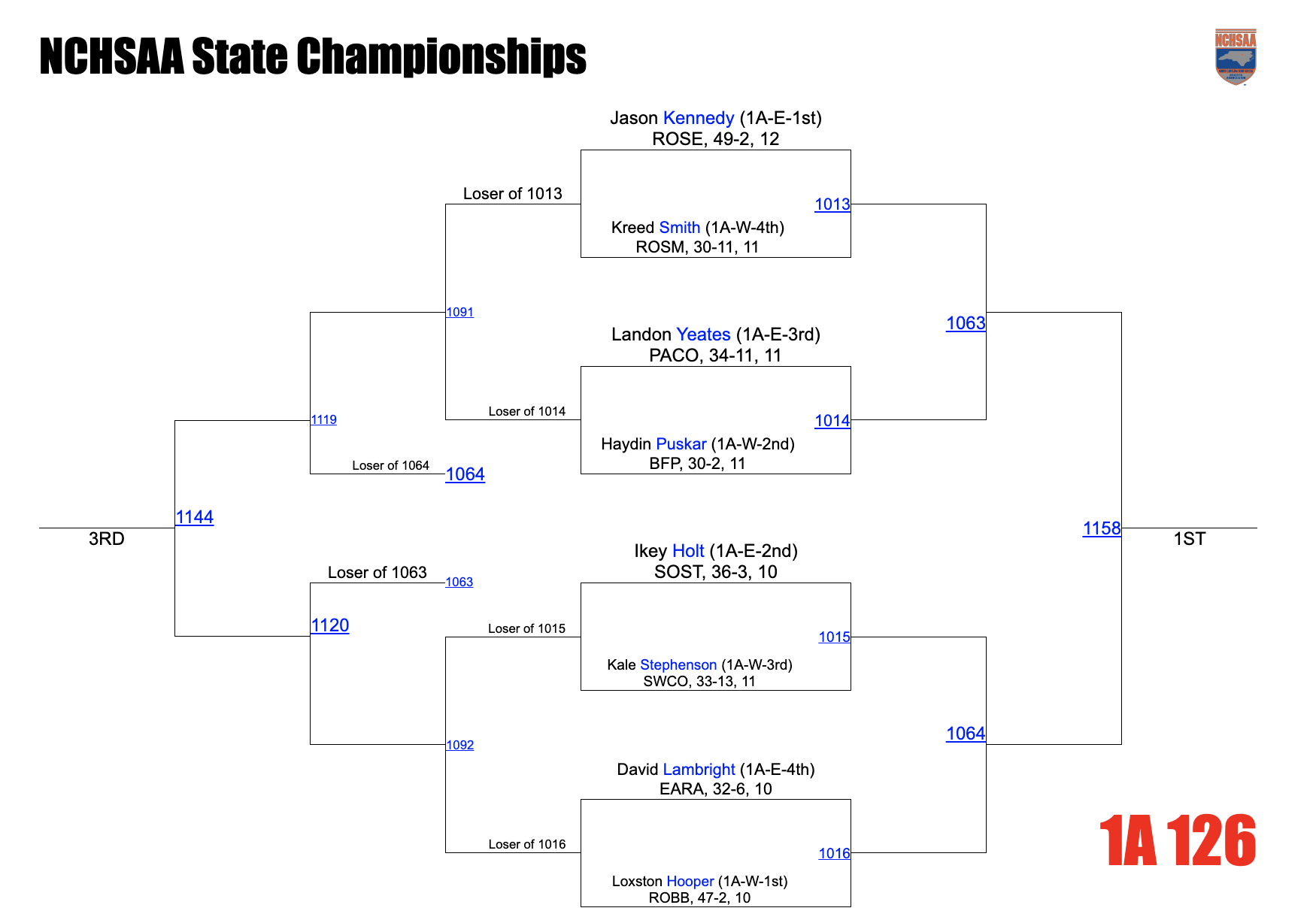 Thoughts: Kennedy or Hooper? Those are your two region champs and have to be considered the favorites to take care of their sides of the bracket. Loxston Hooper won the West with a forfeit of Puskar. Kennedy won the East with a 14-8 decision of Holt. Hooper was 3rd last year at 120 and Hooper and Kennedy haven’t seen one another this season from what I can find. Kennedy has wrestled much of the year up at 132 with his only loss at 126 coming to Auden Goodman of Swansboro. Hooper has been at 126 all season and is 50-3. Both Holt and Puskar are returning SQ’s, but it looks like this one might come down to Hooper and Kennedy. Keep an eye on Stephenson who was 4th last year at 113 - he vs. Holt in the opening round is probably the best 1st round matchup.