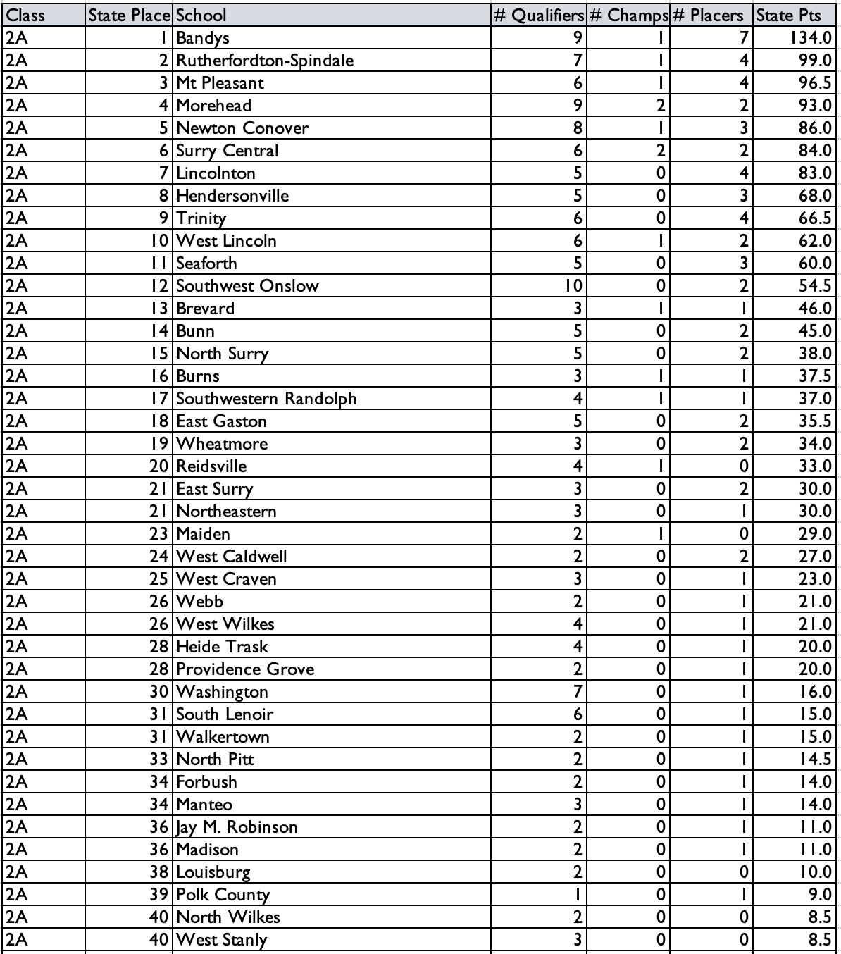 The correlation between # of qualifiers and team points is quite strong at 0.83. We could draw a scatterplot and determine whether the 0.83 is statistically significant or not, but that is getting in the weeds a bit. The basic way to look at a correlation is whether there is a linear relationship between the two variables (# of qualifiers and team points) … and at 0.83 it is considered by many to be a strong correlation (and a stronger correlation than we saw in either 3A or 4A). So what does that mean … well typically the more qualifiers you have the more likely you are to score a lot of points. Keep in mind though that there are always outliers in the data. Southwest Onslow qualified 10, but finished in 12th. With 10 qualifiers they had more in the field than any other team - numbers are important, but they do not always equal points. Brevard had just 3 qualifiers and finished one place behind Southwest Onslow. The takeaway … more qualifiers mean more opportunities, but they don’t guarantee anything.