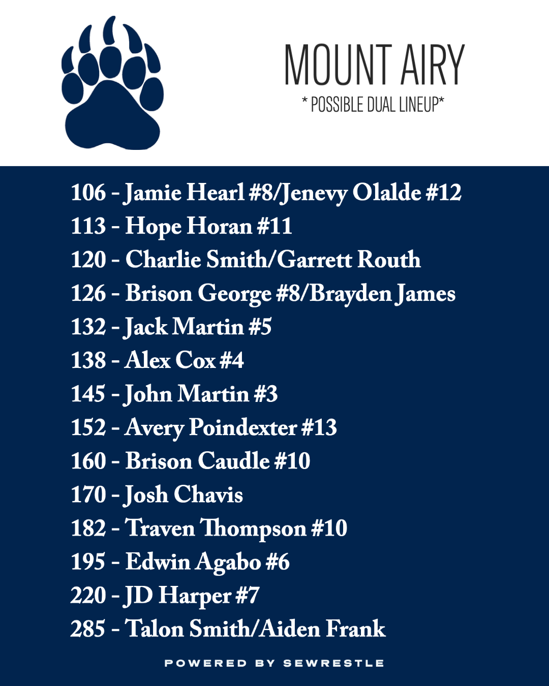 Avery is very tough from 106-132 and get up on teams very fast if given the opportunity. Mt Airy must slow down Avery in that stretch of matches and get to 138, 145, and 160 within striking distance. Cael Dunn and Seth Blackledge are very tough up top for Avery (up to 182), but beyond that they might struggle (where Airy could put up wins/falls with Agabo and Harper).