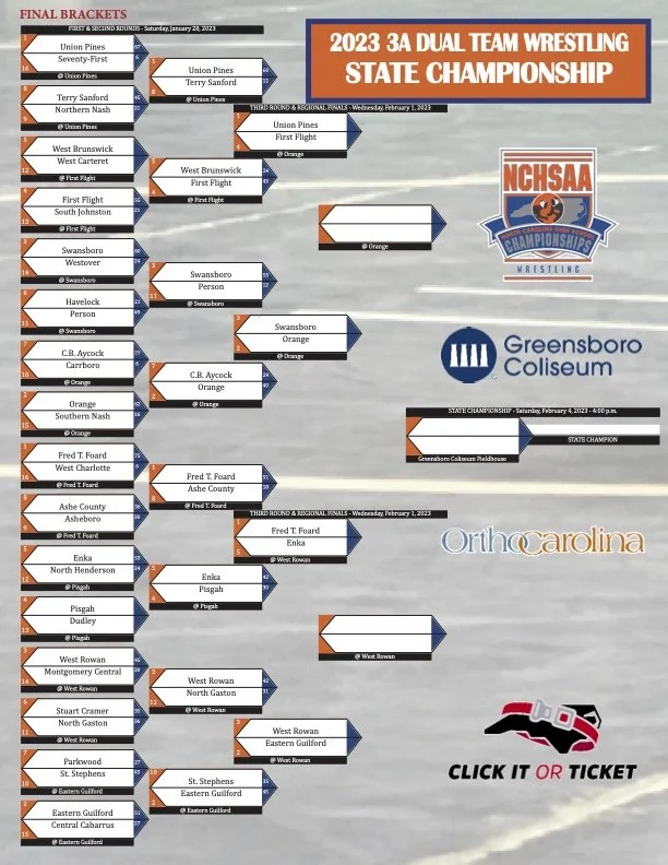 We have reached the Elite 8 and if we believe the ranking we have a couple of “Cinderellas” still dancing after the opening weekend of the state series. Because the NCHSAA uses rankwrestlers.com for their seeding (or at the very least the separation in the bracket - we have included their current ranking below). Like other Fan’s Guides … we are not in the business of predictions - interested in that in North Carolina? Visit Carolina Takedown Talk on Rokfin. Rhett and Ryan are happy to give you their two cents on who they think will win it all.