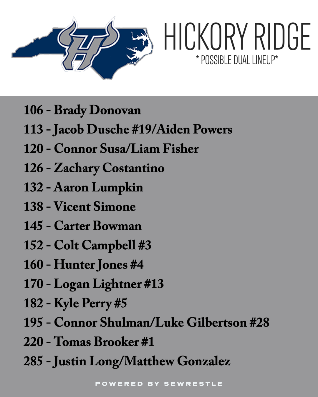 This could be a tale of two duals … Piedmont is tough from 113-132 and Hickory Ridge has hammers from 152-182 and at 220 with Brooker. If Hickory needs him I’d expect we could see Brooker even go up to 285 to wrestle Goodman (even though Brooker is a true 195). Don’t be surprised if an unranked vs. unranked matchup decides who moves on.