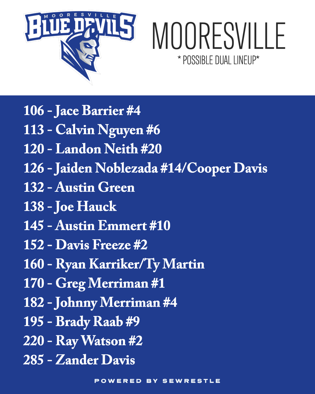 On paper this dual looks outstanding. Strength vs. Strength at so many weights … don’t be surprised to see a team bump one hammer to meet another (for example; Freeze to meet Pepin or Pepin up to meet Merriman) if the dual is on the line. Don’t be surprised if we see Vermilyea wrestle 160, Pepin at 170, and then Attridge up at 182 … but so many things could happen that would either force that to happen or negate it from happening. This is a given - NW Guilford needs to make a run from 126-145 and they need bonus … that could really dictate what happens from that point forward in terms of matchups.